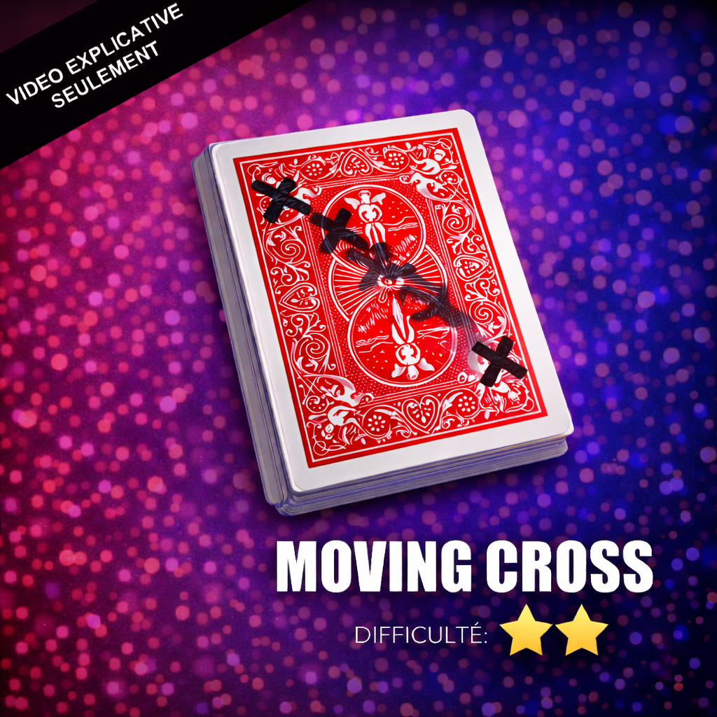Une carte choisie librement par un spectateur est signée, le magicien dessine une croix sur le dos de la carte puis replace cette dernière sous le Cellophane de l’étui de cartes. Visuellement la croix se déplace sur la carte pour finir à l’opposée !